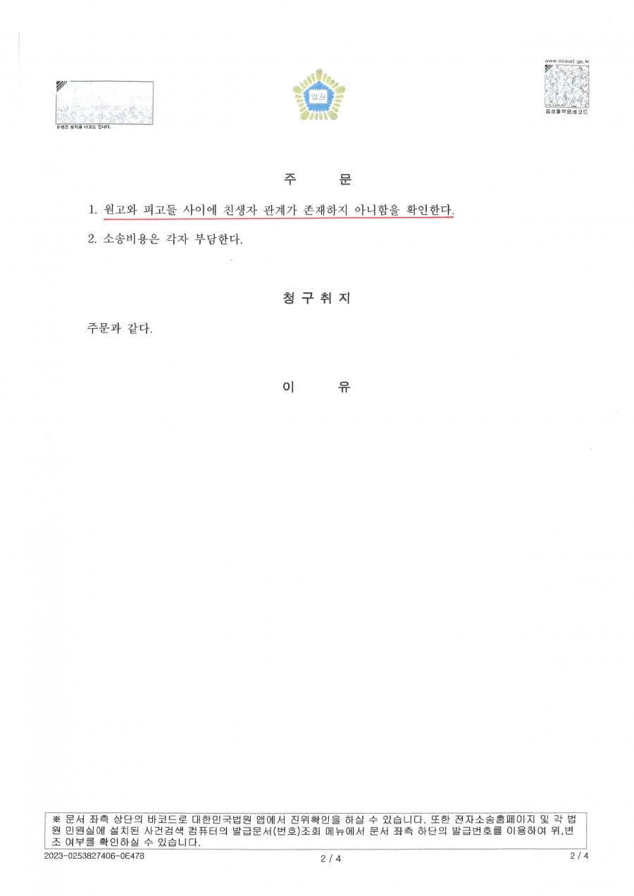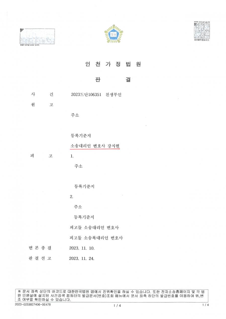 - 사건 : 인천가정법원 2023드단106351호 - 판결요지 : 사망한 배우자의 두 자녀들이 자신의 친자라고 출생신고된 사실을 알고 이를 정정하기 위하여 친생자관계부존재확인을 구한 사건.