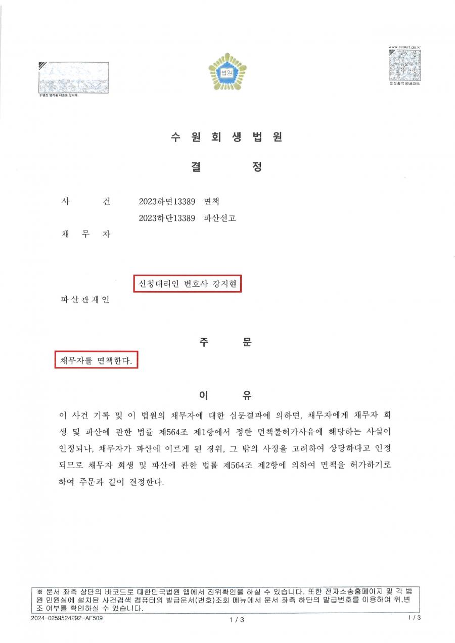 - 사건 : 수원회생법원 2023하면13389 면책 / 2023하단13389 파산선고